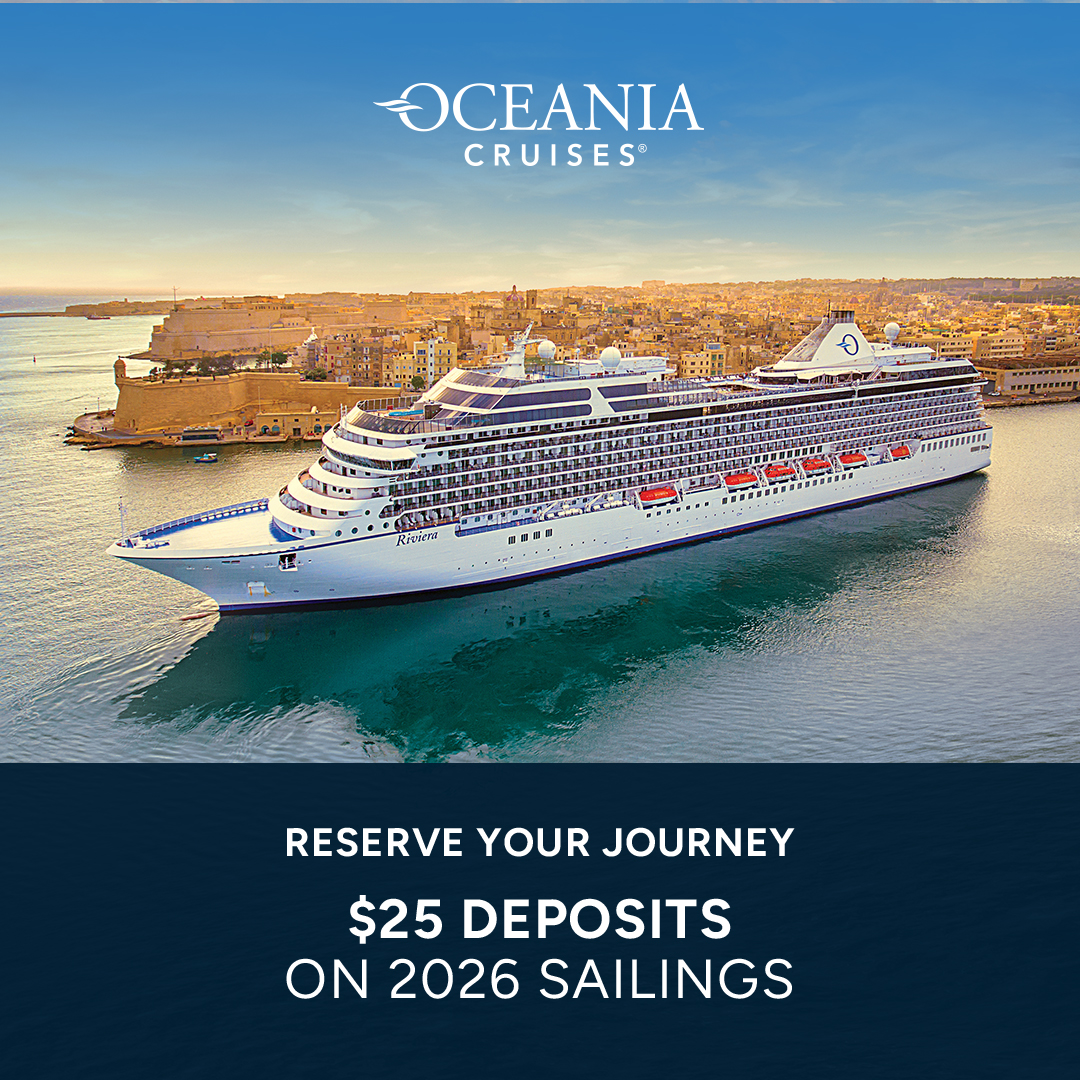 login for solo traveler). Contact your Travel Advisor for more details. Fares are based on published Full/Brochure Fares; such fares do not include optional charges as detailed in the Guest Ticket Contract, which may be viewed through your Travel Advisor. All cruise fares include gratuities for stateroom/suite attendants, butlers and dining waitstaff, as well as government taxes and fees. For other services or purchases made onboard, additional gratuities of 20% apply. Not all promotions are combinable. Oceania Cruises may collect, use, share and secure your personal data as described in our privacy policy, which is available through your Travel Advisor. Oceania Cruises reserves the right to correct errors or omissions and to change any and all fares, fees, promotions and surcharges at any time. Ships’ Registry: Marshall Islands. APR2601112