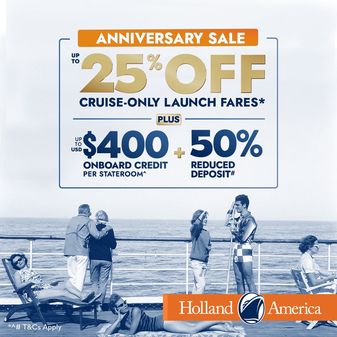 Holland America’s Anniversary Sale is on now! We’re celebrating 153 years of savouring the journey by offering you these limited-time savings on selected itineraries: